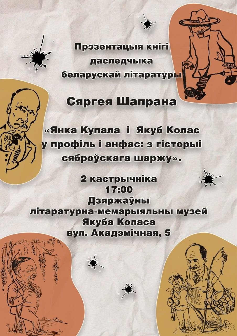 2 кастрычніка 2025 года ў 17.00 Дзяржаўны літаратурна-мемарыяльны музей Якуба Коласа запрашае на прэзентацыю кнігі даследчыка беларускай літаратуры Сяргея Шапрана «Янка Купала і Якуб Колас у профіль і анфас: з гісторыі сяброўскага шаржу». На вядомых нам партрэтах народных паэтаў Беларусі Янкі Купалы і Якуба Коласа, тых партрэтах, якія мы прывыклі бачыць у падручніках і кнігах, пісьменнікі звычайна паказаны сталымі і сур’ёзнымі. Але неаднойчы класікі беларускай літаратуры выступалі героямі сяброўскіх шаржаў. Мастакі Б. Антаноўскі, Берк, Л. Бойка, В. і А. Волкавы, Е. Ганкін, Г. Дакальская, К. Елісееў, І. Ігін, Я. Кашкель, Д. Красільнікаў, Кукрыніксы, М. Малевіч, З. Паўлоўскі, С. Раманаў, Г. Розэ, А. Тарасенкаў прадстаўлялі песняроў жартаўлівымі, смешнымі і па-сяброўску іранічнымі. Такія вобразы пісьменнікаў не знаёмы шырокаму колу прыхільнікаў творчасці паэтаў. Мастакі, многія з якіх былі асабіста знаёмымі ці сябравалі з паэтамі, ілюстравалі іх творы, па-майстэрску перадалі не толькі знешні выгляд пісьменнікаў, але і адлюстравалі іх звычкі, захапленні, паказалі свае глыбокія веды творчай спадчыны пісьменнікаў. Сяброўскі шарж стаў паўнапраўным жанрам выяўленчага мастацтва, але доўгі час заставаўся па-за ўвагай мастацтвазнаўцаў і даследчыкаў літаратуры. Сяргей Шапран прадставіў першае грунтоўнае даследаванне арыгінальнага жанру сяброўскіх замалёвак, раскрываючы перад чытачамі шаржы на Янку Купалу і Якуба Коласа, якія доўгі час у пераважнай большасці заставаліся невядомымі, захоўваючыся ў падшыўках старых газет і часопісах. У новым выданні ўпершыню апавядаецца пра ўсе вядомыя на сёння сяброўскія шаржы на Янку Купалу і Якуба Коласа, якія былі зроблены пераважна пры жыцці класікаў.