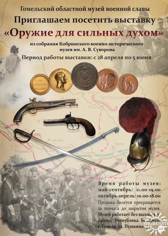 В выставочном зале Гомельского областного музея военной славы размещена выставка «Оружие для сильных духом» из собраний Кобринского военно-исторического музея им. А.В. Суворова и Гомельского областного музея военной славы.