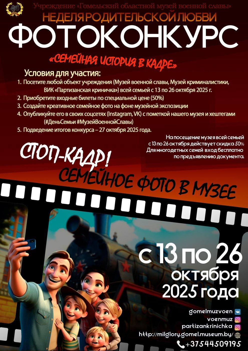 Дорогие друзья, семья – это наш личный музей любви, памяти и преемственности поколений. В рамках Недели родительской любви Гомельский областной музей военной славы объявляет фотоконкурс «Семейная история в кадре». Мы предлагаем вам не просто сделать семейное фото, а создать настоящую семейную реликвию в стенах музея.